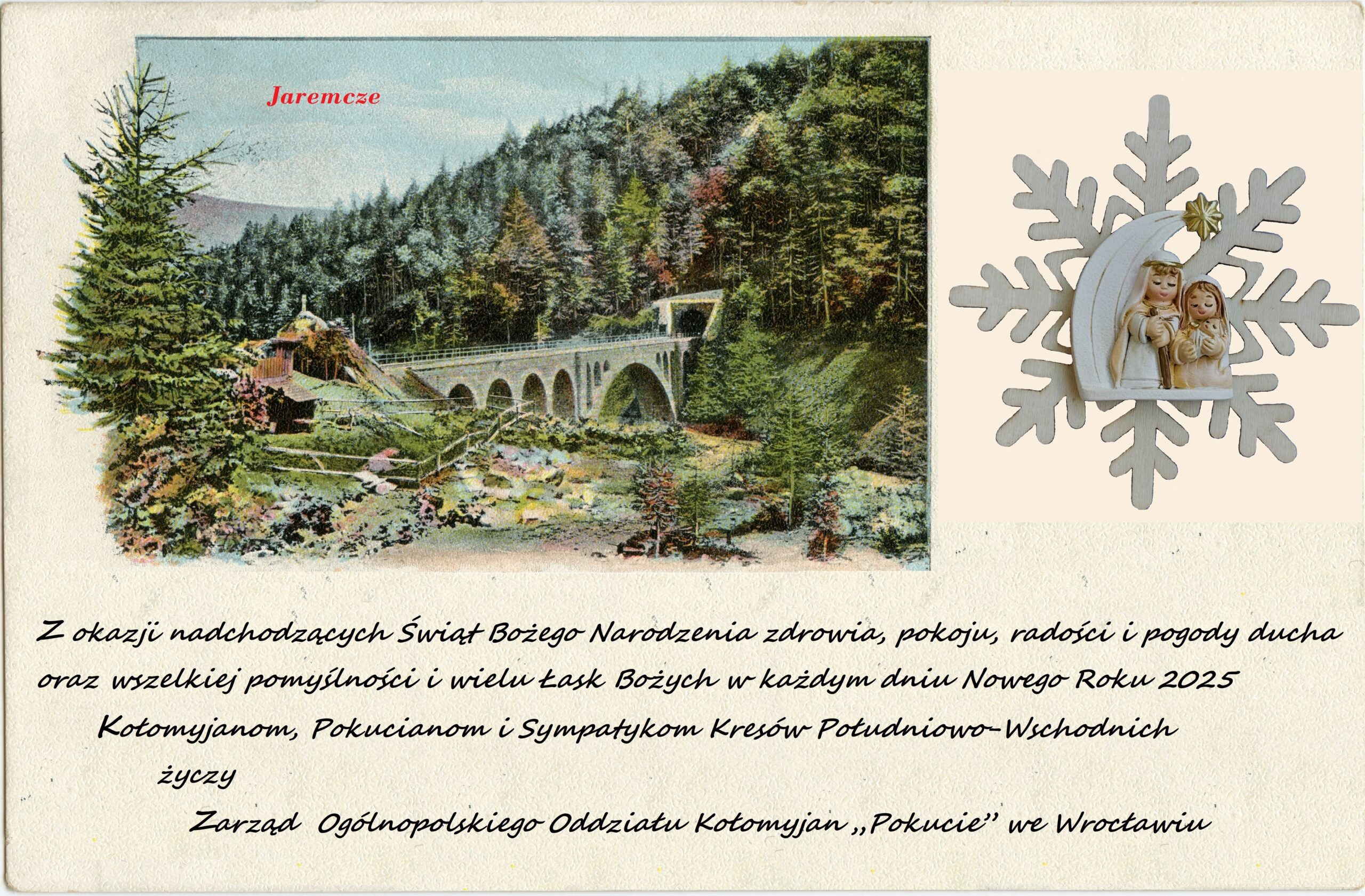 DRODZY KOŁOMYJANIE, POKUCIANIE i SYMPATYCY KRESÓW POŁUDNIOWO – WSCHODNICH Z okazji nadchodzących Świąt Bożego Narodzenia zdrowia, pokoju, radości i pogody ducha oraz wszelkiej pomyślności i wielu Łask Bożych w każdym dniu Nowego Roku 2025 życzy Zarząd Ogólnopolskiego Oddziału Kołomyjan „POKUCIE” we Wrocławiu Jednocześnie pragniemy zaprosić Państwa na tradycyjne już coroczne nasze spotkanie opłatkowe – […]