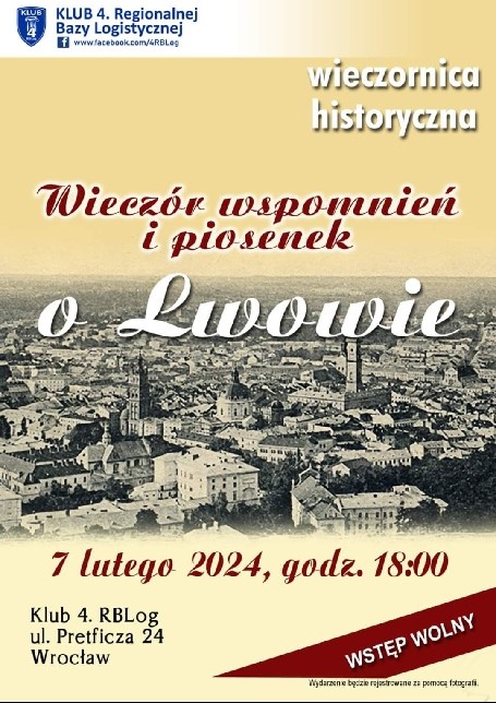ZAPROSZENIE NA WIECZORNICĘ HISTORYCZNĄ Klub 4. RBLog (4 Regionalna Baza Logistyczna) przy ul. Pretficza 24 we Wrocławiu zaprasza w dniu 7 lutego 2024, godz. 18.00 sympatyków Kresów na wieczornicę historyczną – „WIECZÓR WSPOMNIEŃ I PIOSENEK O LWOWIE” Ryszard Saczyński Prezes Zarządu Ogólnopolskiego Oddziału Kołomyjan „POKUCIE” we Wrocławiu