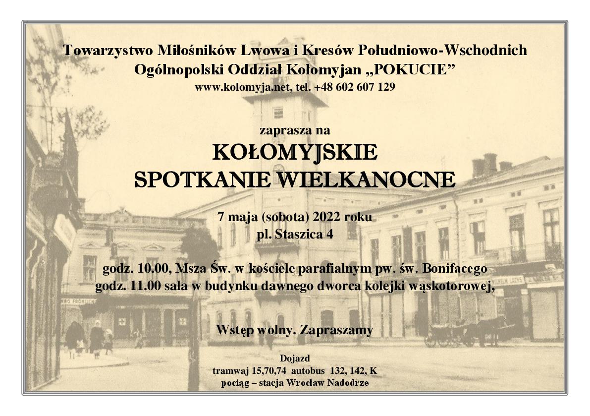 Jak informowałem już wcześniej przy składaniu życzeń wielkanocnych w dniu 7 maja (sobota) serdecznie zapraszamy na długo wyczekiwane przez nas zebranie OOK „Pokucie” we Wrocławiu.
