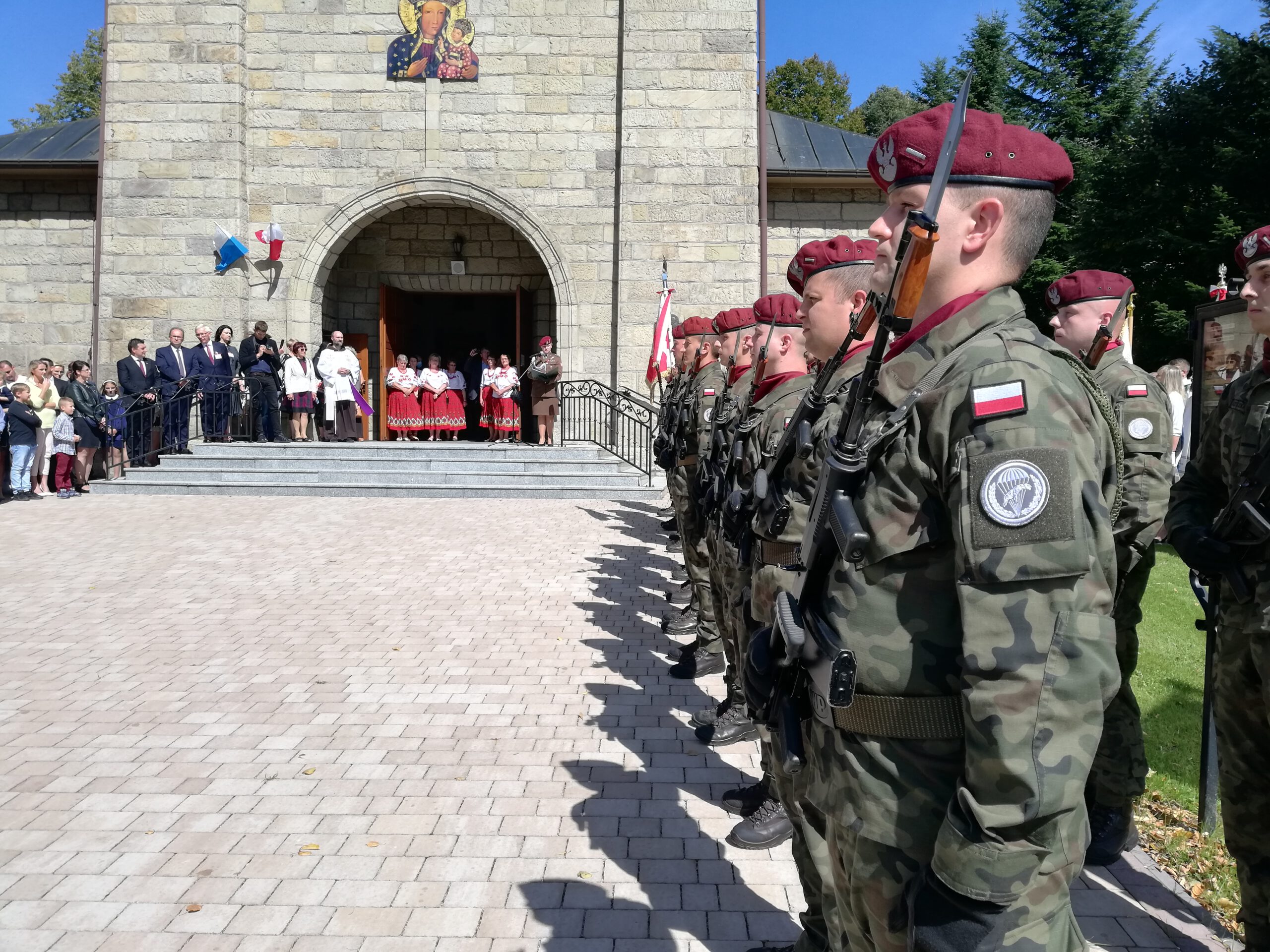 Salwa honorowa przed kościołem parafialnym Nawiedzenia NMP w Skomielnej Czarnej